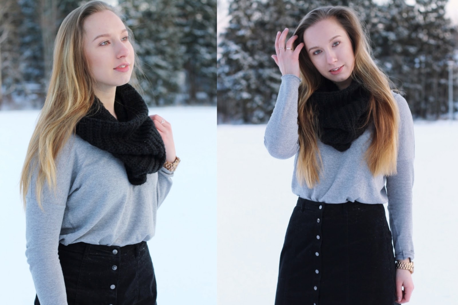Ei hätää napattiin nää kuvat Sagan kanssa maanantaina eikä silloin ollut vielä läheskään yhtä kylmä kun tänään! Jos haluaa talvella ottaa asukuvia niin että joka kuvassa ei ole sama takki päällä, saa vähän palella välillä. Sisällä taas on niin paljon huonompi valo.